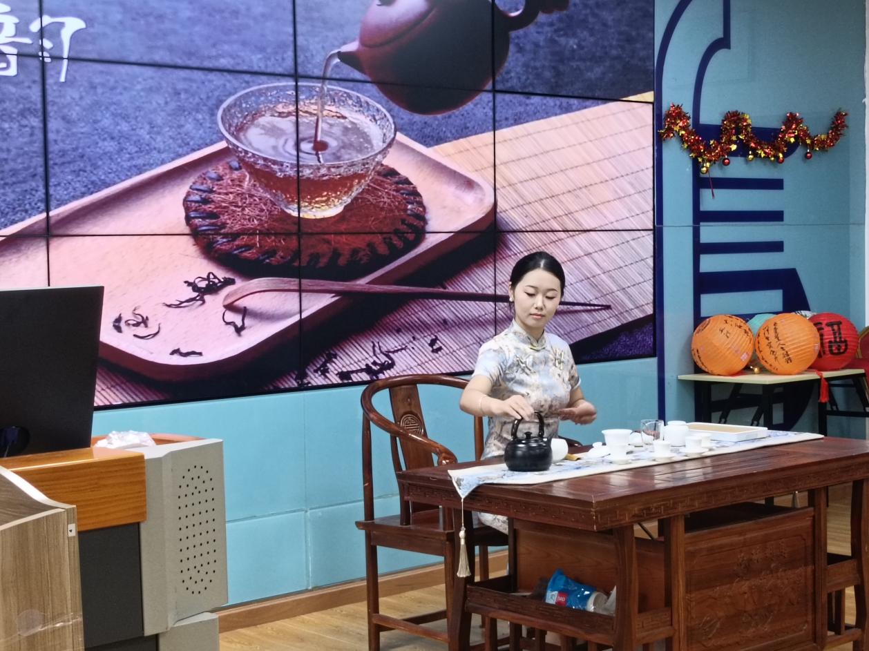 在才艺表演环节,由金鑫、崔祥菊等同学带来的歌曲《稻香》旋律动人、演唱富有感染力,瞬间点燃现场,赢得阵阵掌声。同时,陈嫣然同学的茶艺表演别具一格,作为串联服务体验与文化传播的关键纽带,其在冲泡、奉茶等动作里尽显文化底蕴与服务细节,展现茶文化魅力与学子专业素养,为活动增添了浓厚的文化氛围。