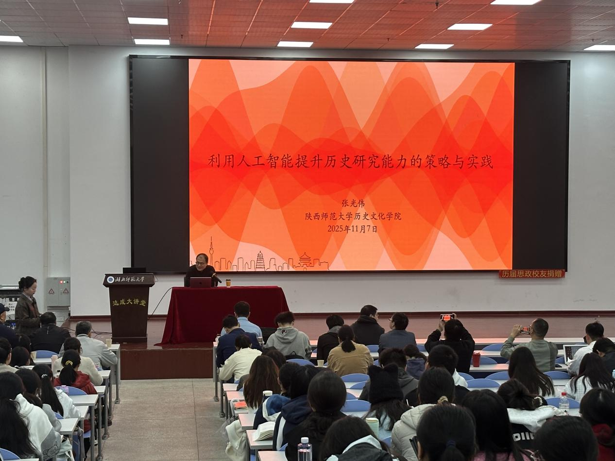 11月7日,在人文楼达成大讲堂,我院成功举办AI 历史研究系列讲座。陕西师范大学历史文化学院张光伟老师与南京大学历史学院王涛教授受邀莅临,联袂开讲,通过四场极具启发与创见的专题分享,为全校师生带来了一场人工智能与历史学交叉融合的学术盛宴。