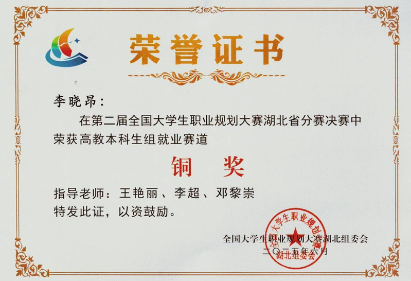 我院李晓昂同学在第二届全国大学生职业生涯规划大赛湖北省分赛决赛中荣获高教本科生组就业赛道铜奖!