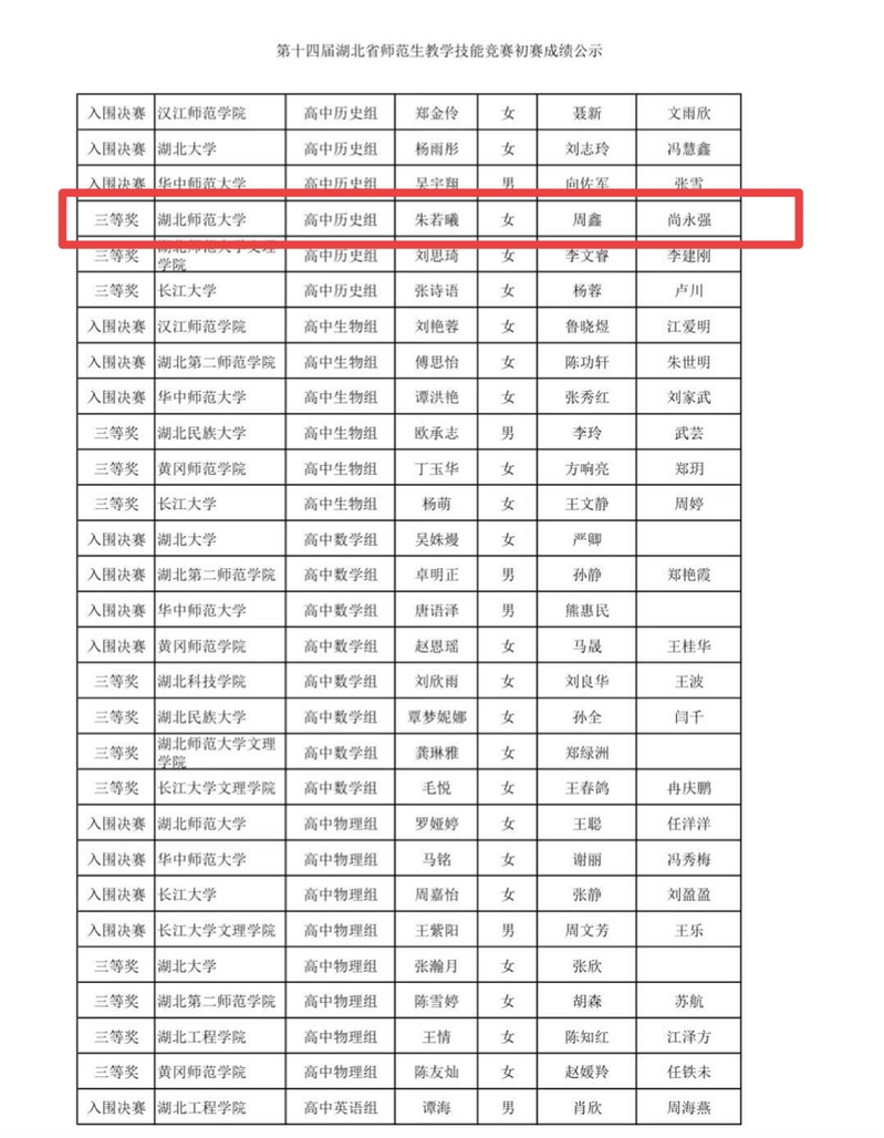 我院23级朱若曦同学,在第十四届湖北省师范生教学技能竞赛荣获高中历史组三等奖!