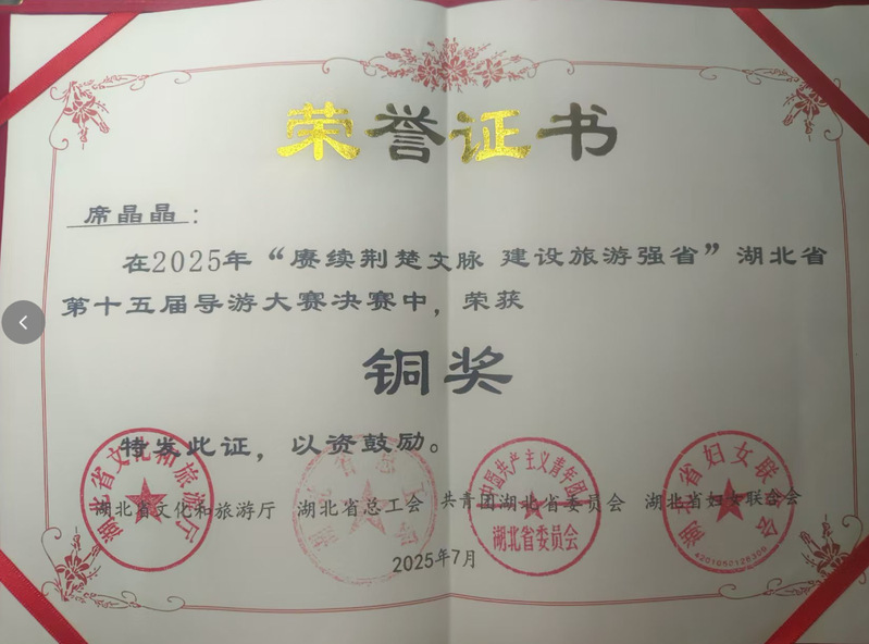我院席晶晶同学,在2025年“赓续荆楚文脉,建设旅游强省”,湖北省第十五届导游大赛决赛中,荣获铜奖!