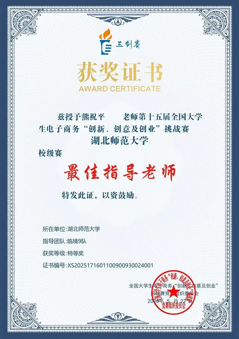 喜报!我院熊祝平老师荣获第十五届三创赛“最佳指导老师”