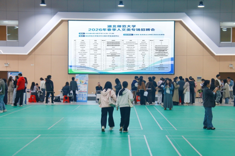 4月16日下午,湖北师范大学2026年春季人文类专场招聘会在大学生活动中心顺利举行。本次招聘会由历史文化学院、马克思主义学院、文学院联合承办,吸引37家用人单位参会,提供就业岗位800余个,全校各专业学生积极参与,现场氛围热烈有序。